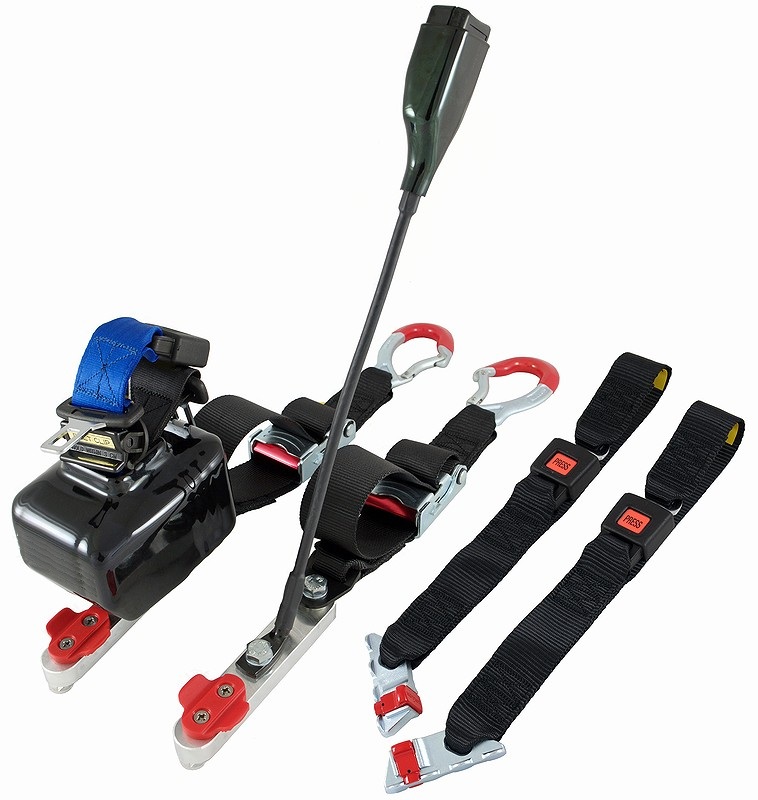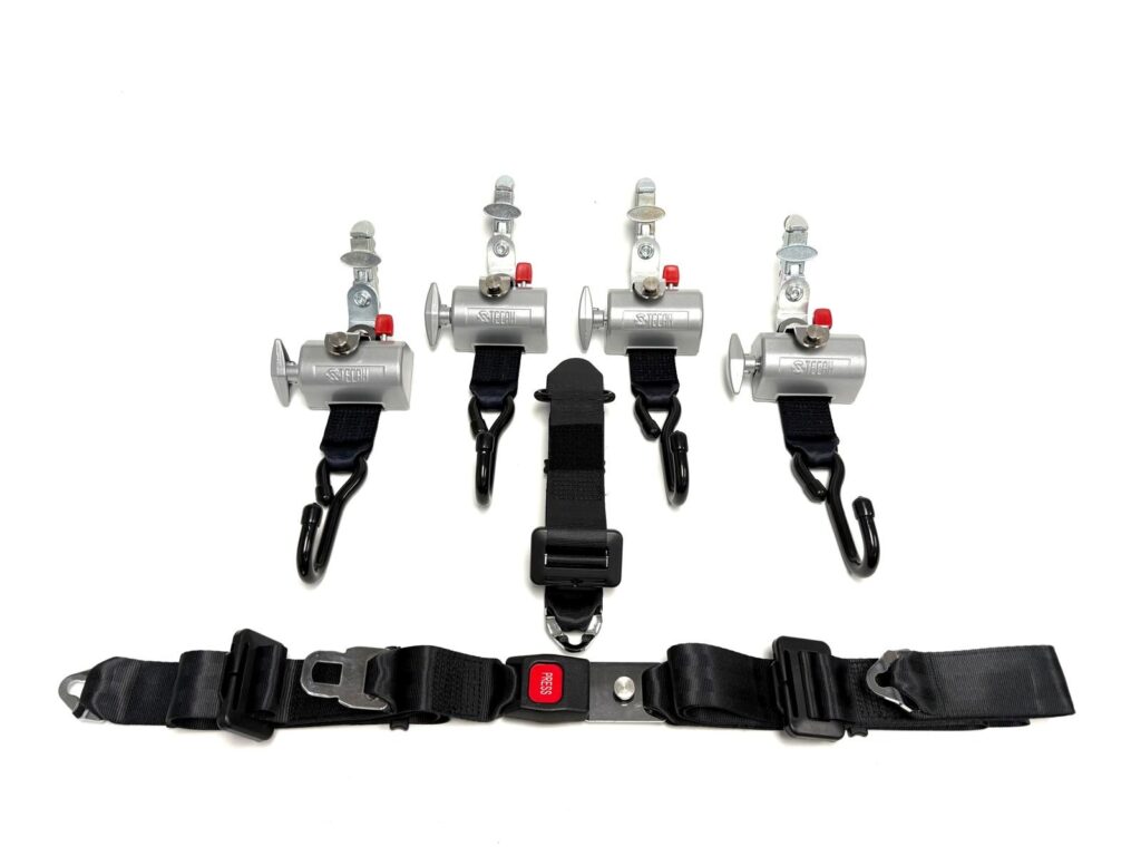 - La combinación de los dos tensores traseros junto al cinturón de pasajero permite una instalación más rápida y un menor espacio de almacenamiento.
